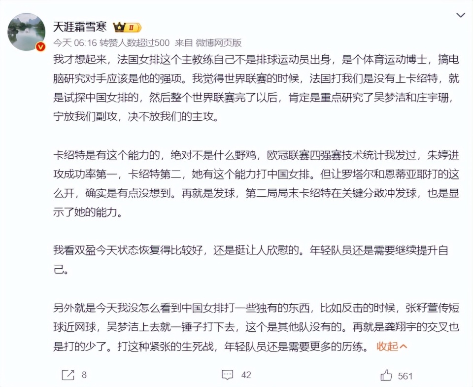 这场比赛的赛后塞萨尔-冈萨雷斯似乎才是最兴奋的那个,他在场馆内跑来跑去,各种握拳庆祝,朝着摄像机摆出大拇指的手势,这人就是法国女排的主教练,来自西班牙的运动科学博主。